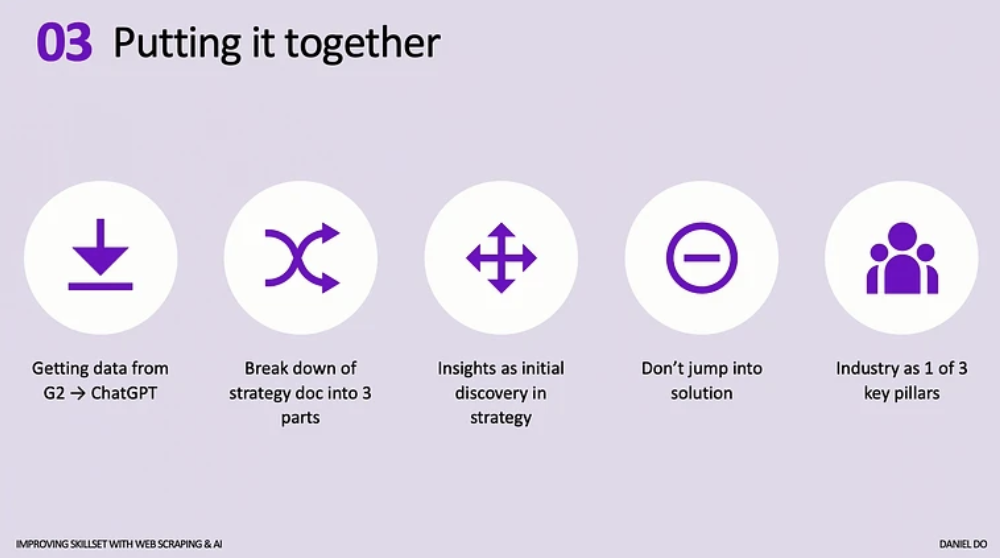 Konkrétně použil Apify – platformu s předpřipravenými scrapery – k získání dat z G2.com, která obsahuje informace o business software. Vytěžil přes 50 tisíc reviews a údajů o konkurentech. Následně data nahrál do ChatGPT s promtem zaměřeným na identifikaci témat podle Jobs-To-Be-Done frameworku, segmentů zákazníků a konkurenčních výhod. Stanovil si i constraints – například že témata chce pouze tehdy, pokud jsou zmíněná alespoň 20krát.